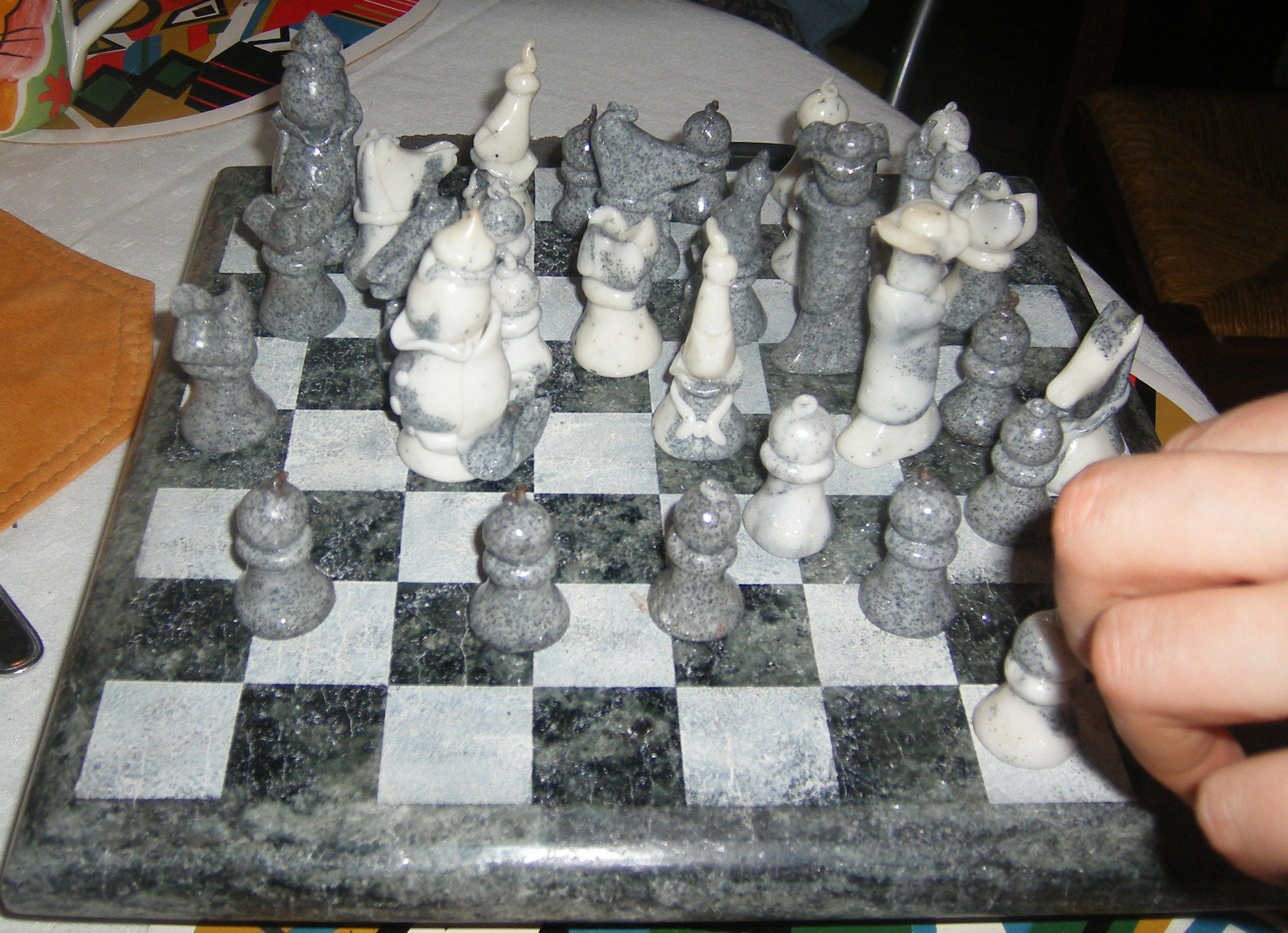 J'ai conçu cet échiquier il y a quelques temps pour un cadeau de Noêl. Le plateau est en granit vert olive . Les pionts assez originaux sont en pâte fimo de couleur grise et blanche. C'est un travail qui a été assez long, mais le résultat est trés joli.